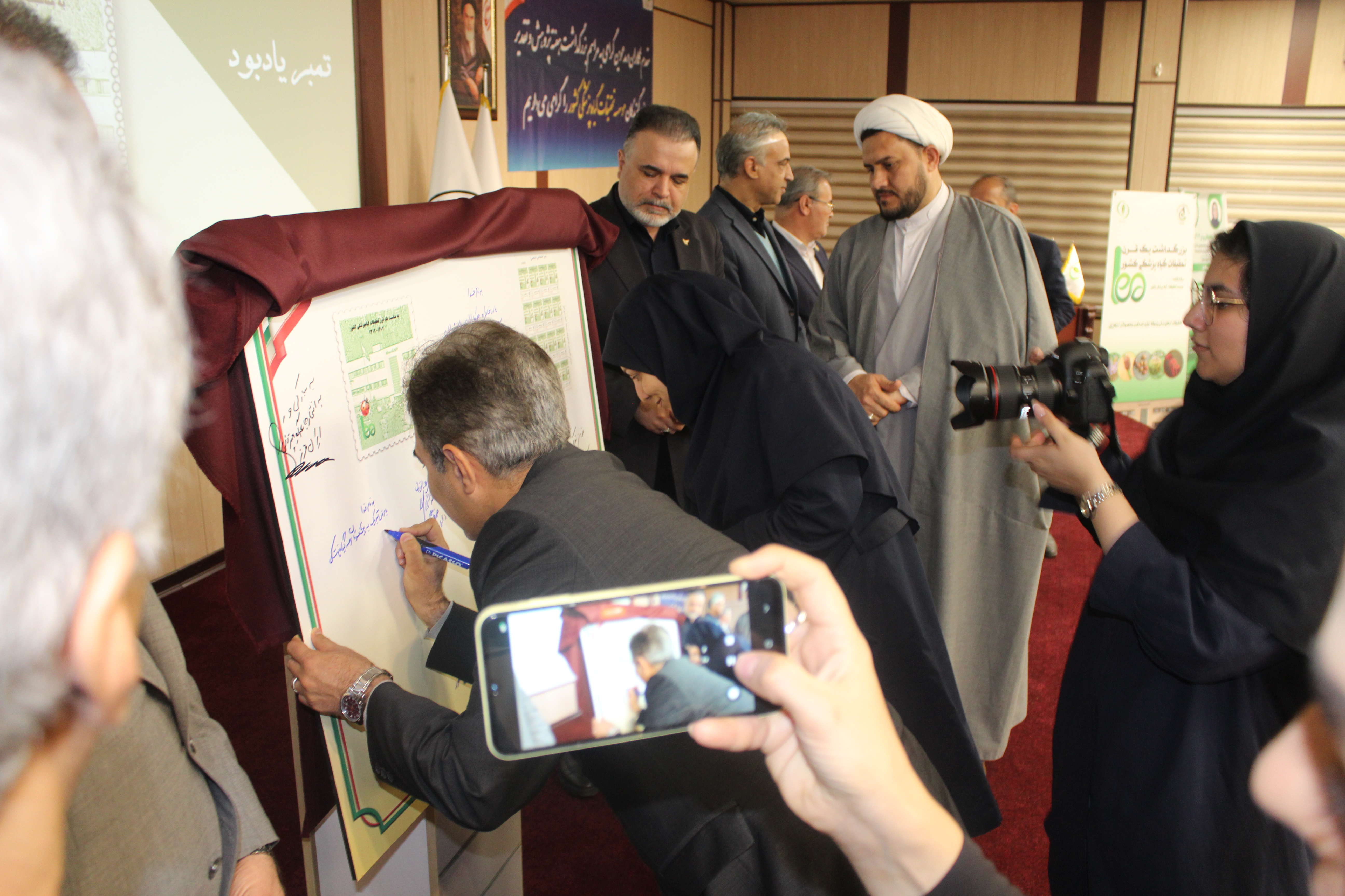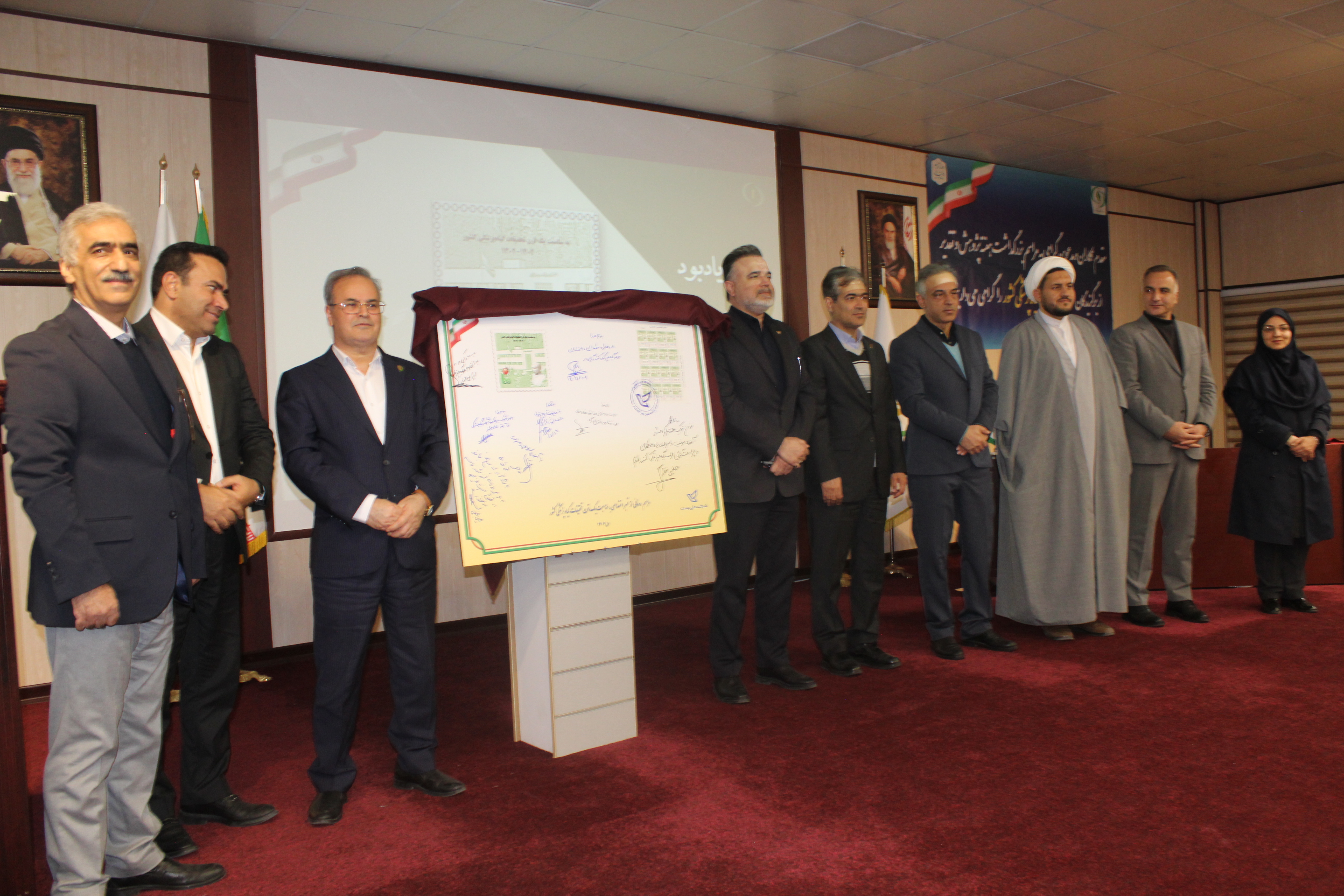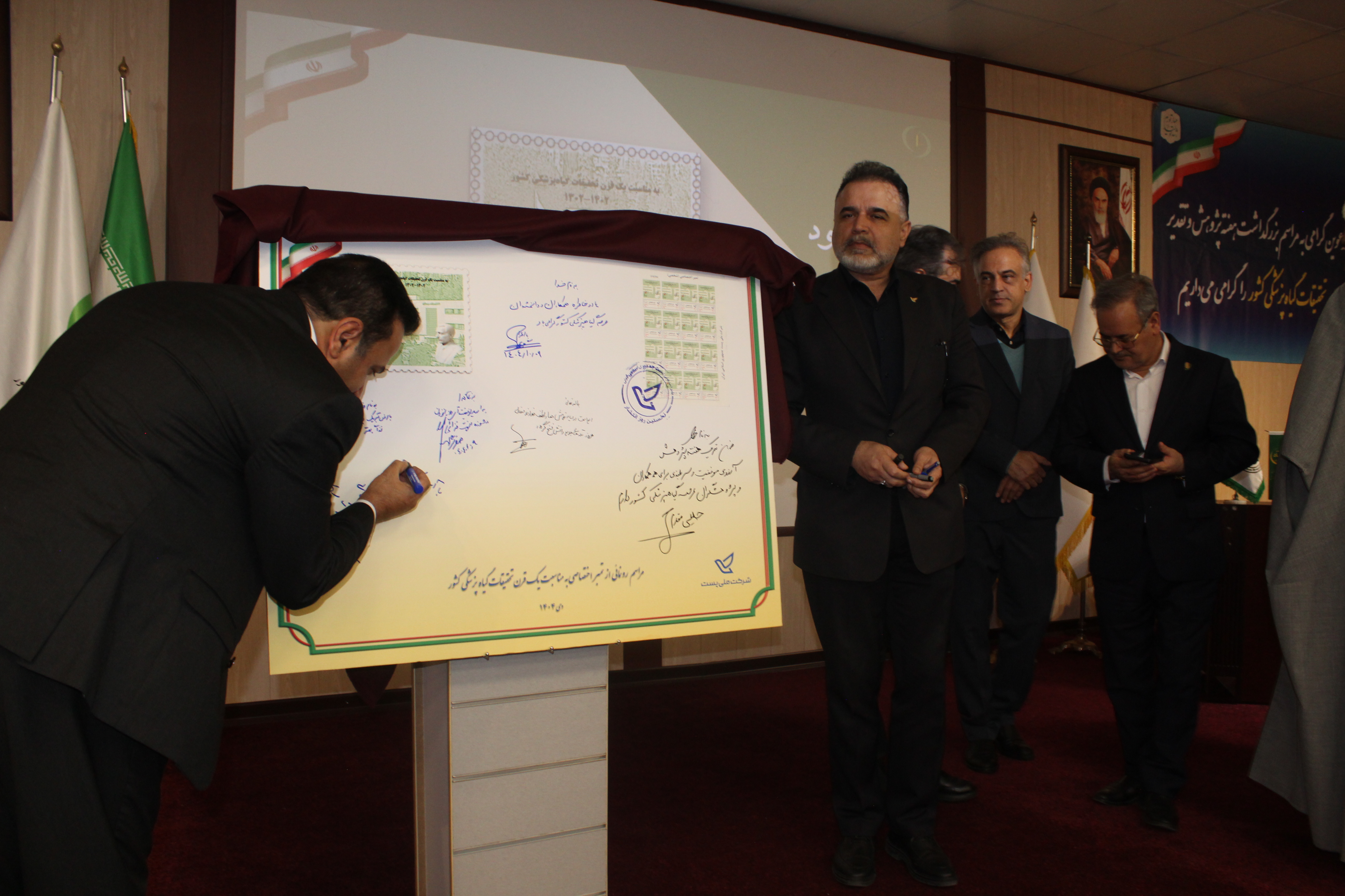 در ادامه رونمایی از تمبر یادبود موسسه تحقیقات گیاهپزشکی کشور به مناسبت یک قرن تحقیقات گیاهپزشکی درحضور مهندس فرجی نماینده شرکت ملی پست ایران؛ لازم به ذکر است تمبر مزبور توسط دکتر گلمحمدی معاون وزیر و رییس سازمان تات و همچنین مجید آنجفی معاون امور زراعت وزارت جهادکشاورزی، ممهور به مهر شرکت ملی پست گردید و سایر حاضرین حاشیه آن را توشیح کردند.