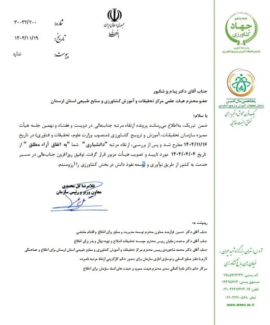 رتبه علمی پیام پزشکپور عضو هیئت علمی بخش تحقیقات علوم زراعی و باغی مرکز تحقیقات و آموزش کشاورزی و منابع طبیعی لرستان به مرتبه دانشیاری ارتقاء یافت