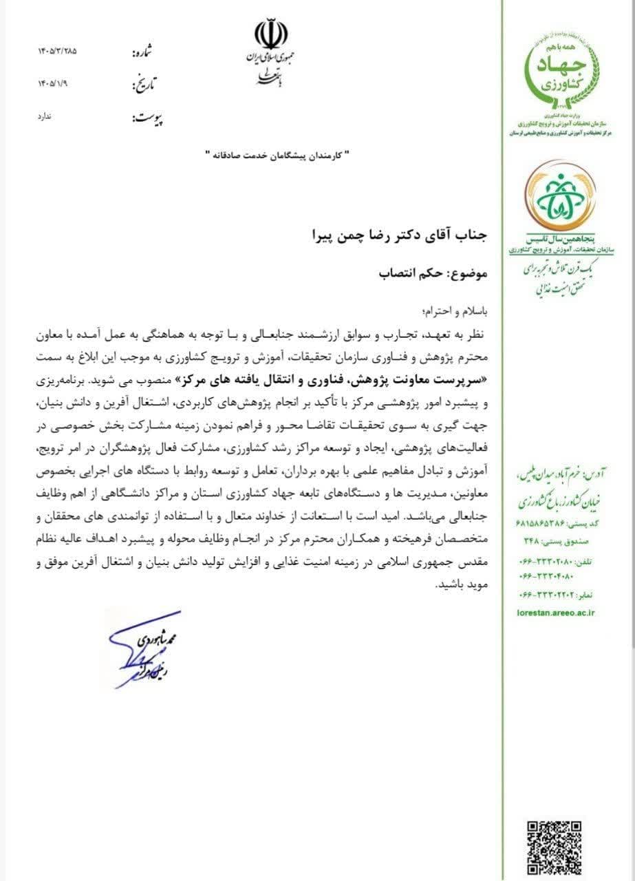نظر به تعهـد، تجـارب و سوابق ارزشـمند جنابعـالی و بـا توجه به هماهنگی به عمل آمـده با معاون محترم پژوهش و فنـاوری سازمان تحقیقات، آموزش و ترویـج کشاورزی به موجب این ابلاغ به سمت «سرپرست معاونت پژوهش، فناوری و انتقال یافته های مرکز» منصوب می شوید.
