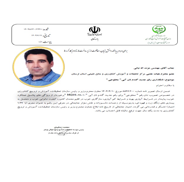 به گزارش روابط عمومی مرکز تحقیقات و آموزش کشاورزی و منابع طبیعی استان لرستان، در همین راستا، دکتر عزت‌اله نباتی محقق و پژوهشگر این مرکز با توجه به نامگذاری قم جدید گندم نان آبی  با نام "محلوجی"   برای جمعیت اصلاح شده  MDH-99-10 با ویژگی‌های زودرس و عملکرد مناسب، مپایدار در شرایط آبیاری بهینه و شرایط کم آبیاری، سازگاری خوب در اقلیم معتدل کشور، کیفیت نانوایی خوب و متحمل به به بیماریهای زنگ زرد و قهوه‌ای به عنوان مجری با امتیاز 1/67 از سوی دکتر محمد زمانیان رئیس موسسه تحقیقات اصلاح و تهیه نهال و بذرکشور مورد تقدیر قرار گرفت.