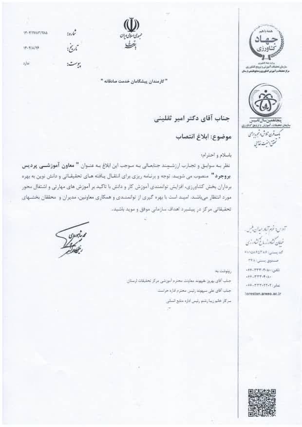 به گزارش روابط عمومی مرکز تحقیقات و آموزش کشاورزی و منابع طبیعی استان لرستان، در این آئین، امیر ثقلینی به عنوان معاون آموزشی جدید پردیس بروجرد منصوب و رسماً مسئولیت راهبری برنامه‌های آموزشی این مجموعه را بر عهده گرفت.