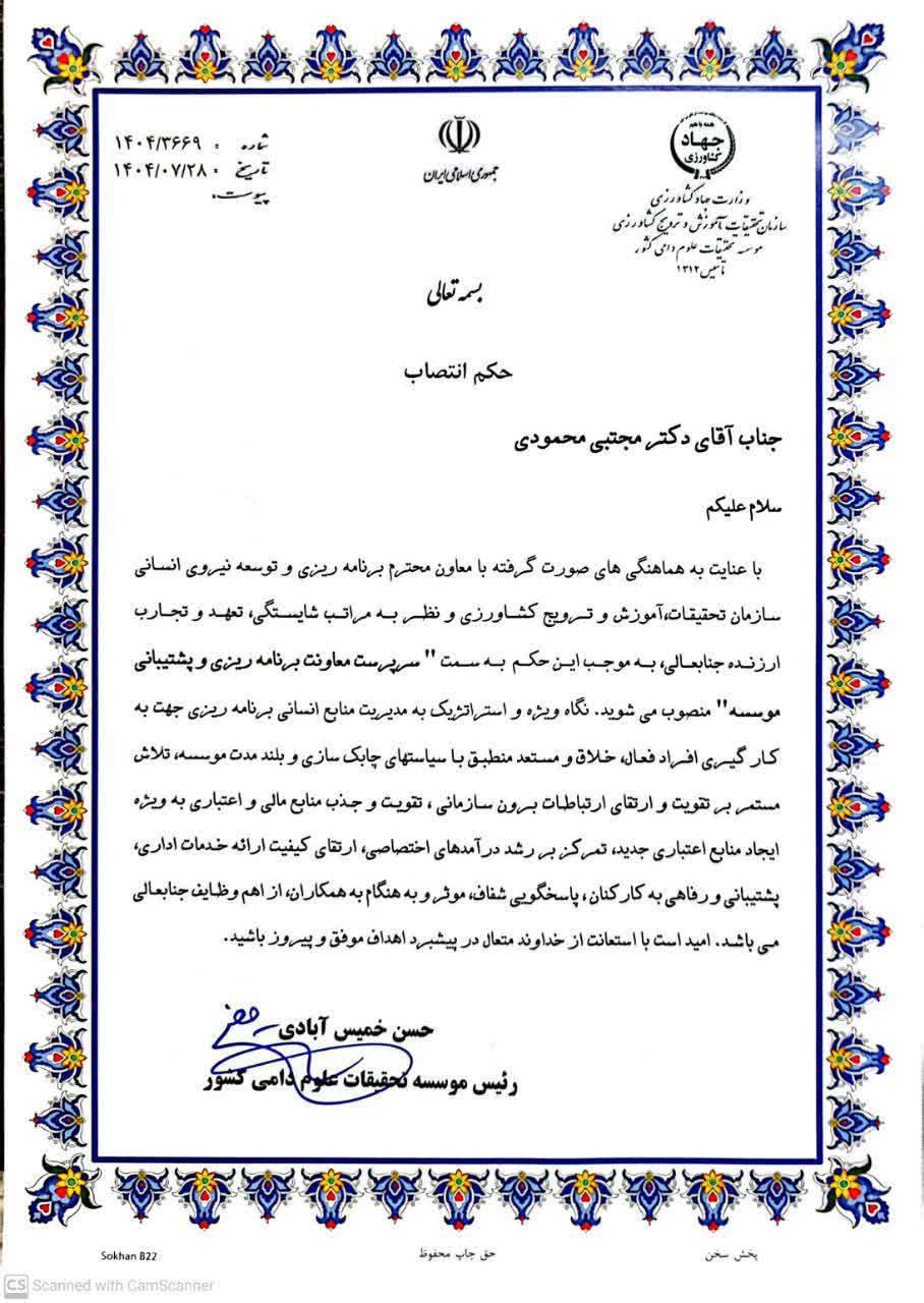 با حکم ریاست مؤسسه تحقیقات علوم دامی کشور، دکتر مجتبی محمودی، سکاندار معاونت برنامهریزی و پشتیبانی مؤسسه شد؛