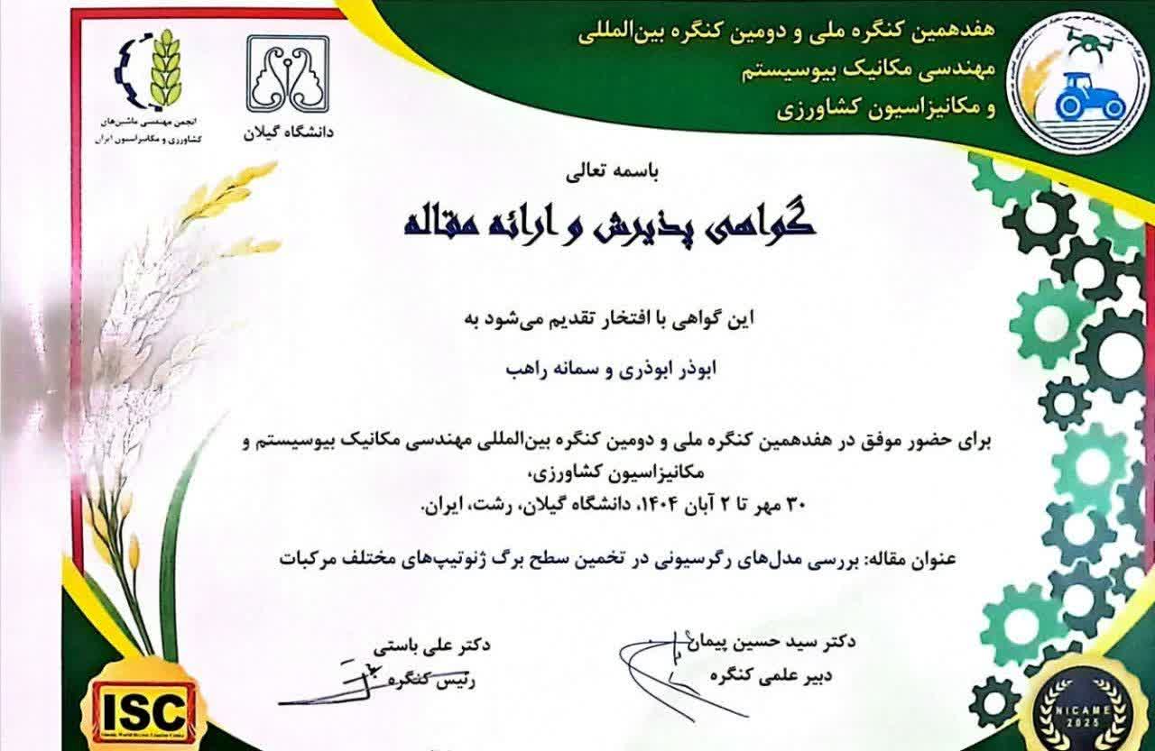 مقاله دکتر ابوذری، عضو هیات علمی مرکز تحقیقات و آموزش کشاورزی و منابع طبیعی مازندران، در هفدهمین کنگره ملی و دومین کنگره بین المللی پذیرفته و ارائه شد.