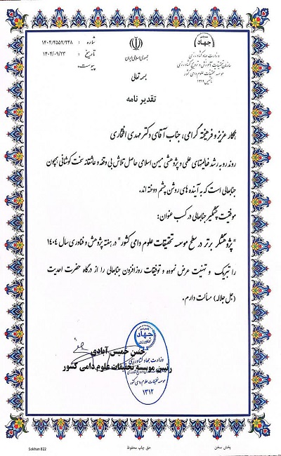 در آئین نکوداشت هفته پژوهش که در مؤسسه تحقیقات علوم دامی کشور و با حضور جمعی از مدیران، پژوهشگران و فعالان حوزه تحقیق و فناوری برگزار شد، دکتر مهدی افتخاری، عضو هیئت علمی و رئیس مرکز رشد کشاورزی و منابع طبیعی قزوین، به عنوان پژوهشگر برتر استانی مورد تقدیر قرار گرفت