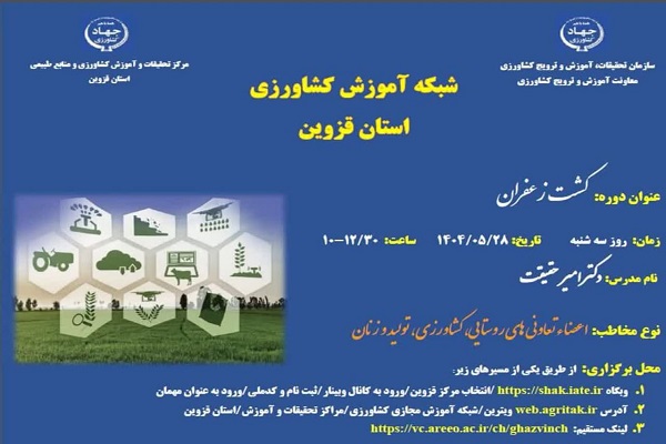 وبینار آموزشی " کشت زعفران" برای مخاطبین اعضای تعاونی روستائی،کشاورزی ، تولید و اشتغال زنان روستائی  توسط امیر حقیقت مدرس مرکز تحقیقات و آموزش کشاورزی قزوین در :