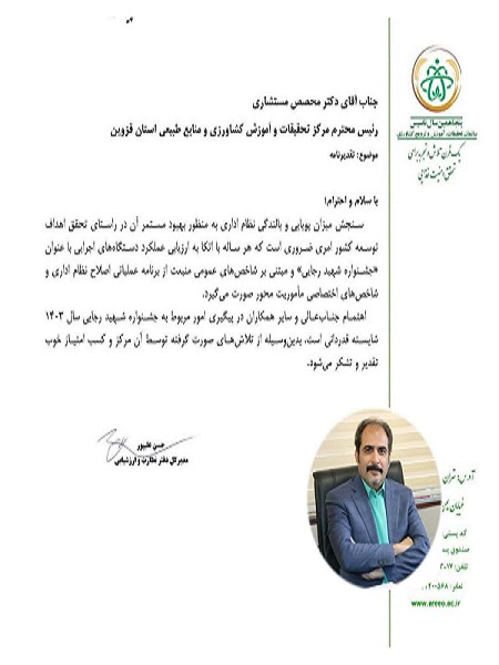 حسن علیپور مدیرکل دفتر نظارت و ارزشیابی سازمان تات، طی ارسال تقدیرنامه، از تلاشهای صورت گرفته توسط  ریاست و کارکنان مرکز تحقیقات و آموزش کشاورزی و منابع طبیعی قزوین، در جشنواره شهید رجائی سال 1403 تقدیر و تشکر کرد