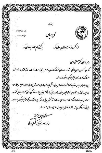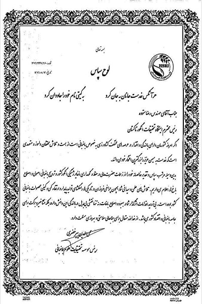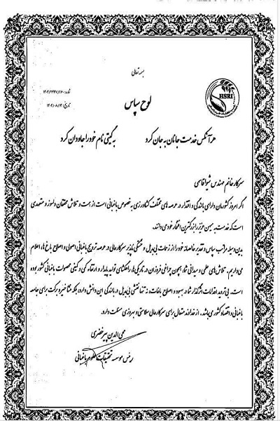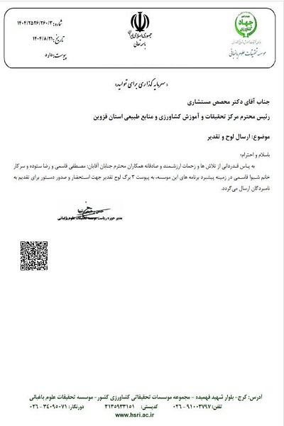 مؤسسه تحقیقات باغبانی کشور از دکتر مهرزاد محصص مستشاری  به پاس قدردانی از تلاش ها و زحمات ارزشمند و صادقانه همکاران این مرکز ، دکتر مصطفی قاسمی، مهندس شیوا قاسمی و مهندس رضا ستوده  در زمینه پیشبرد برنامه های  موسسه تحقیقات باغبانی با ارسال لوح تقدیر کرد