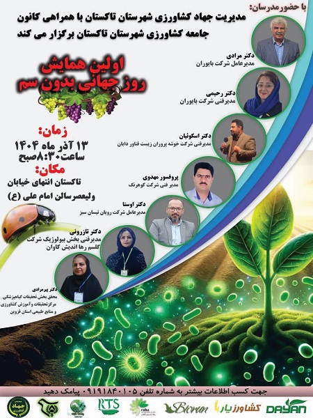 ولین همابش روز جهانی بدون سم با هدف تشویق بهره برداران به کاهش مصرف سموم شیمیایی و استفاده از سموم غیر شیمیایی کم خطر همزمان با روز جهانی بدون سم توسط مدیریت جهاد کشاورزی شهرستان و بسیج مهندسین شهرستان تاکستان برگزار شد.