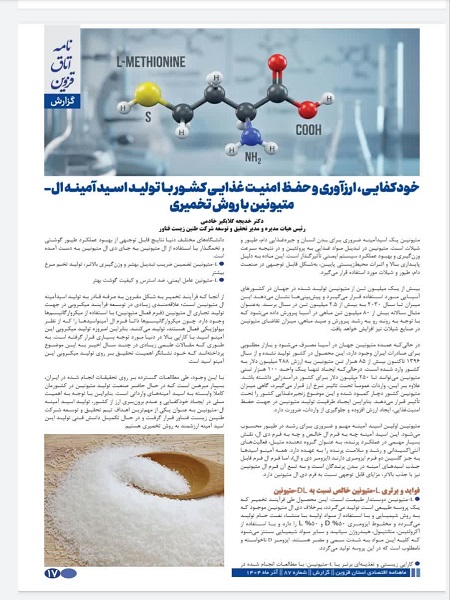 « خودکفایی، ارزآوری و حفظ امنیت غذایی کشور با تولید اسید آمینه ال- متیونین با روش تخمیری » در این نشریه منتشر شد