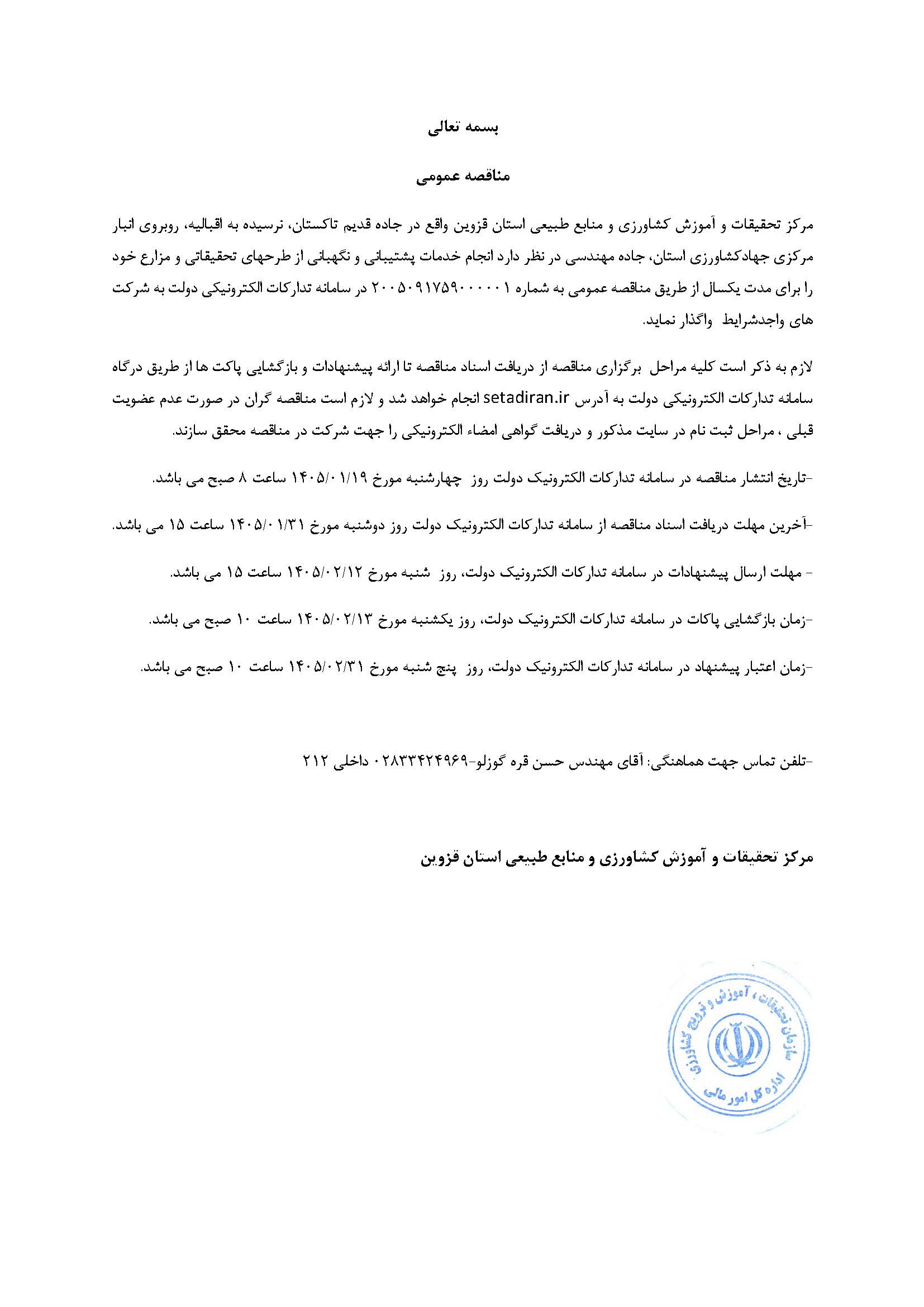 | مهلت دریافت اسناد | ۳۱ فروردین ۱۴۰۵ | ۰۷:۵۴ |