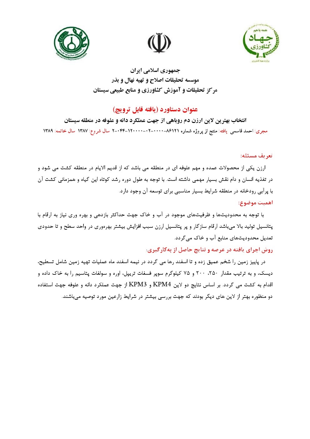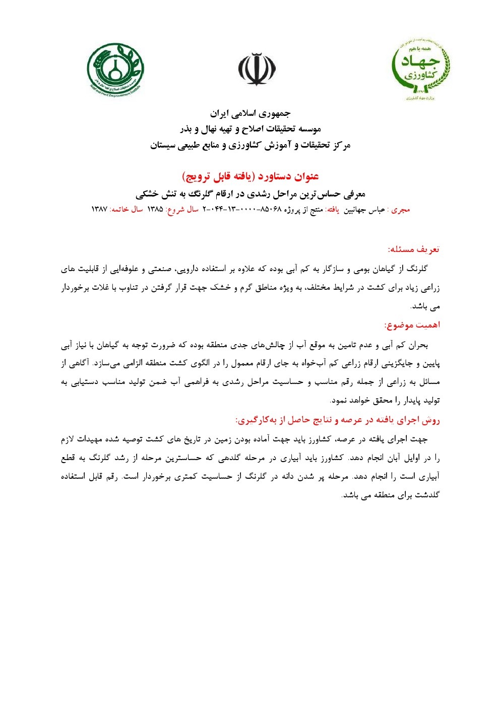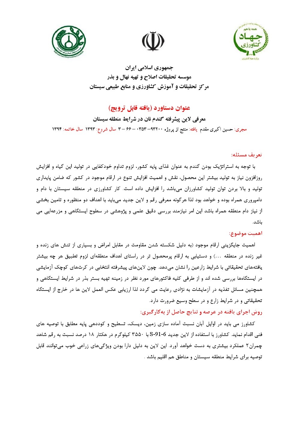 معرفی لاین پیشرفته گندم نان در شرایط منطقه سیستان