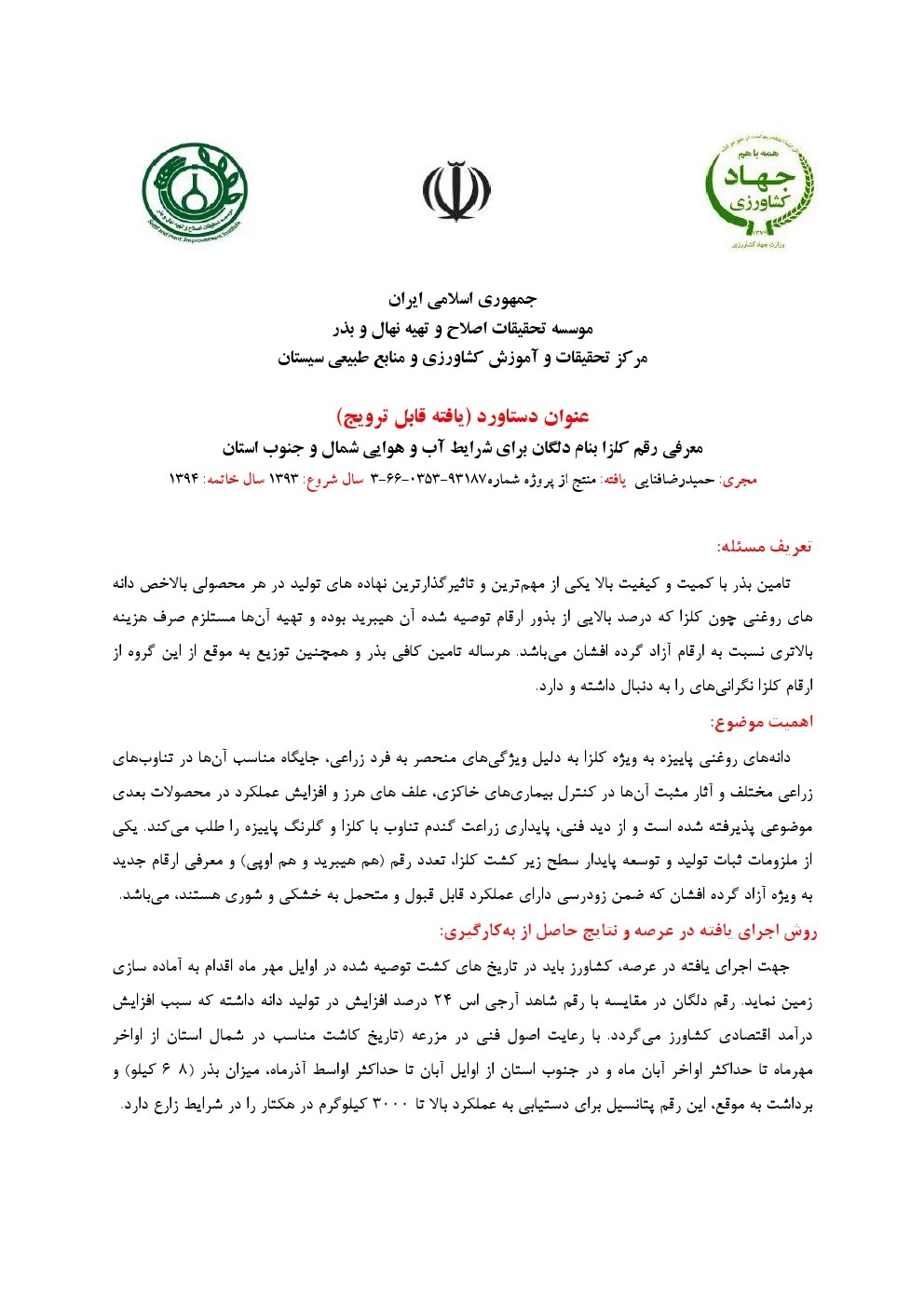 معرفی رقم کلزا بنام دلگان برای شرایط آب و هوایی شمال و جنوب استان