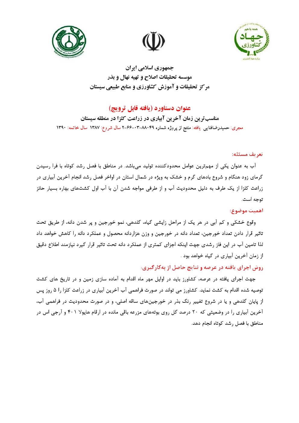مناسب‌ترین زمان آخرین آبیاری در زراعت کلزا در منطقه سیستان