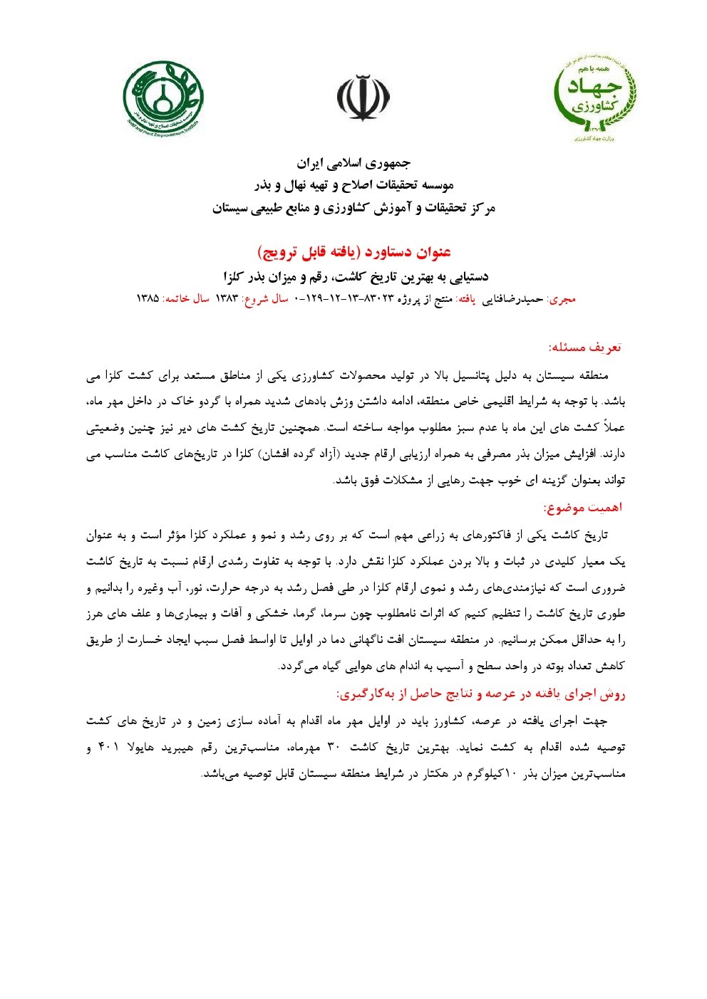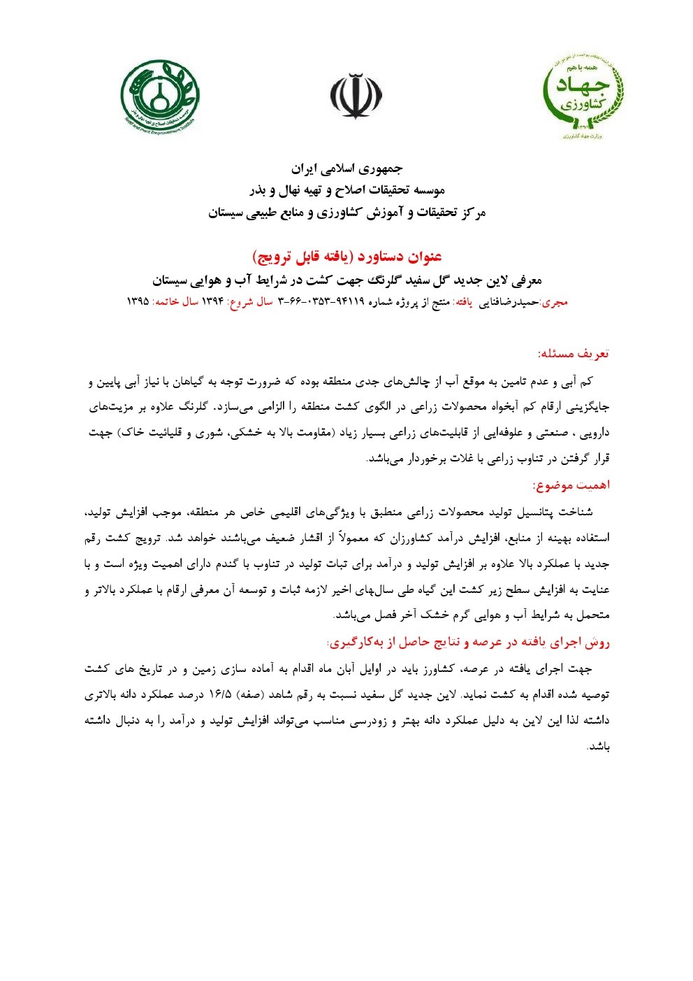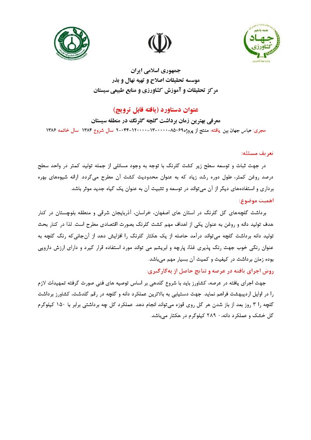 معرفی لاین جدید گل سفید گلرنگ جهت کشت در شرایط آب و هوایی سیستان