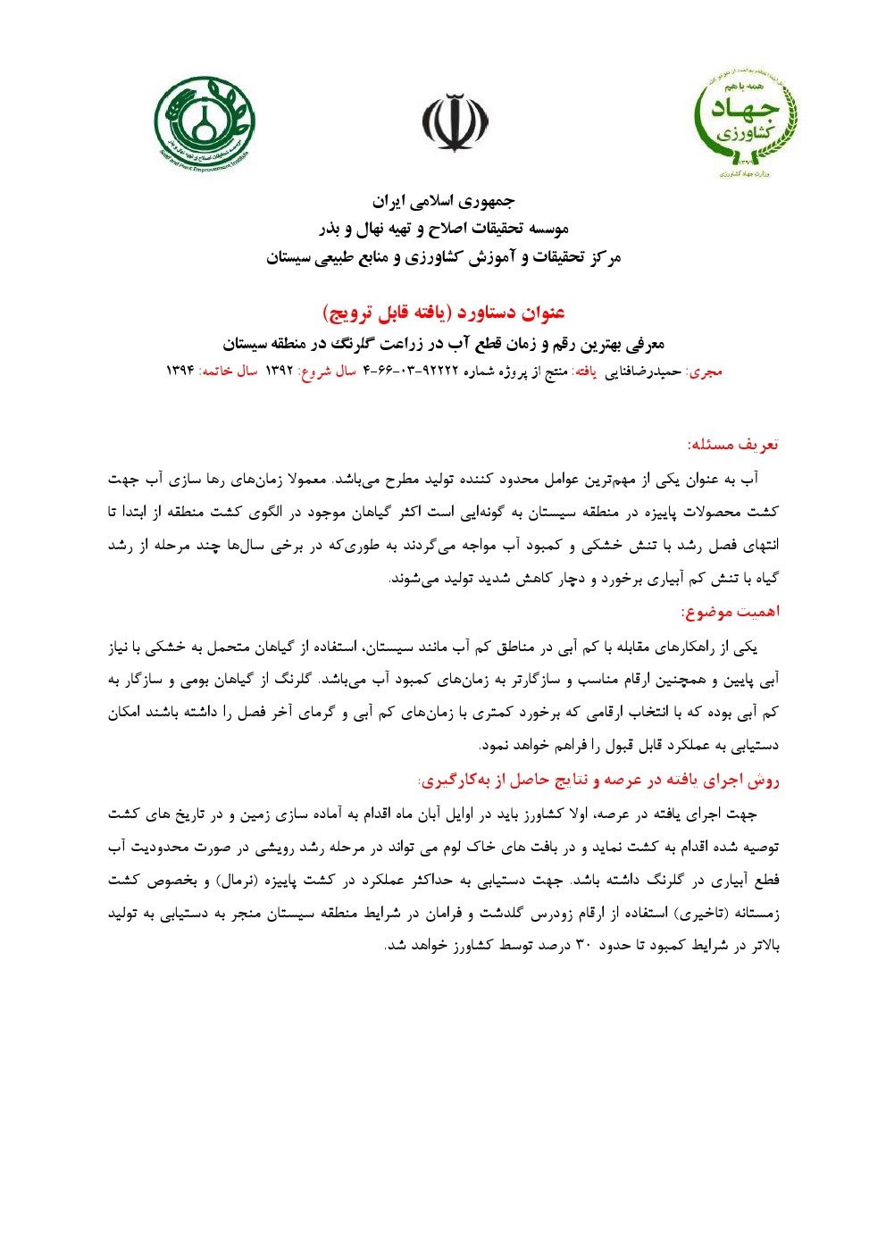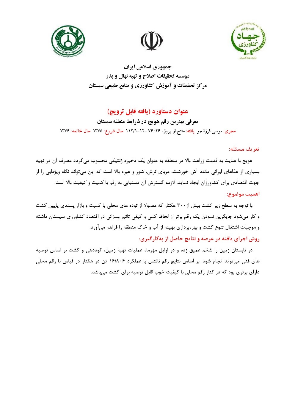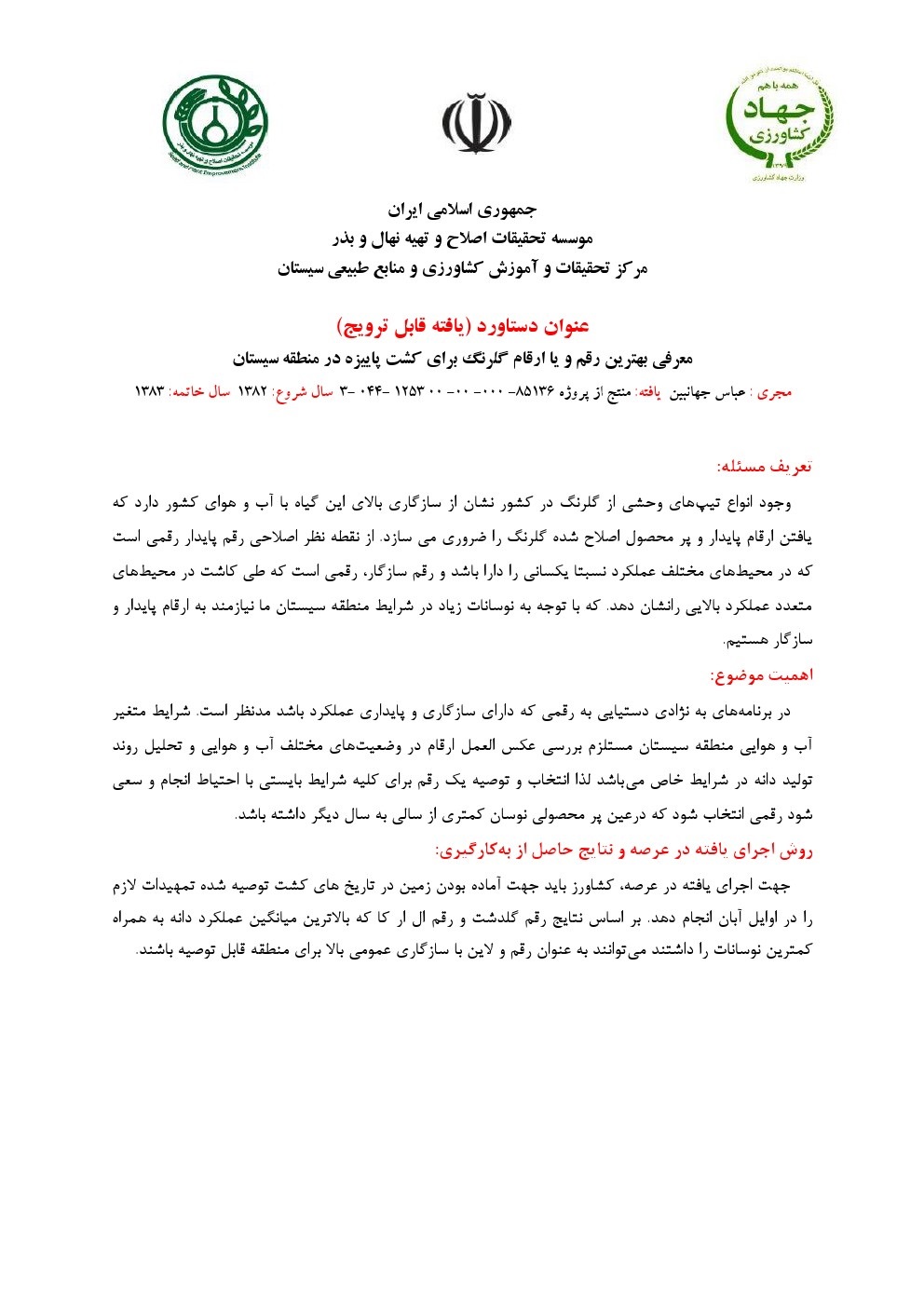 معرفی لاین جدید گل سفید گلرنگ جهت کشت در شرایط آب و هوایی سیستان