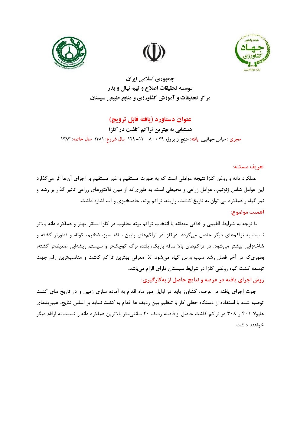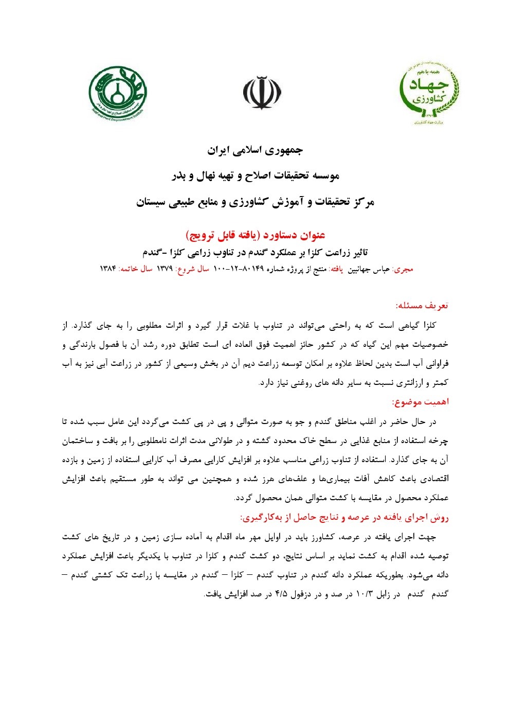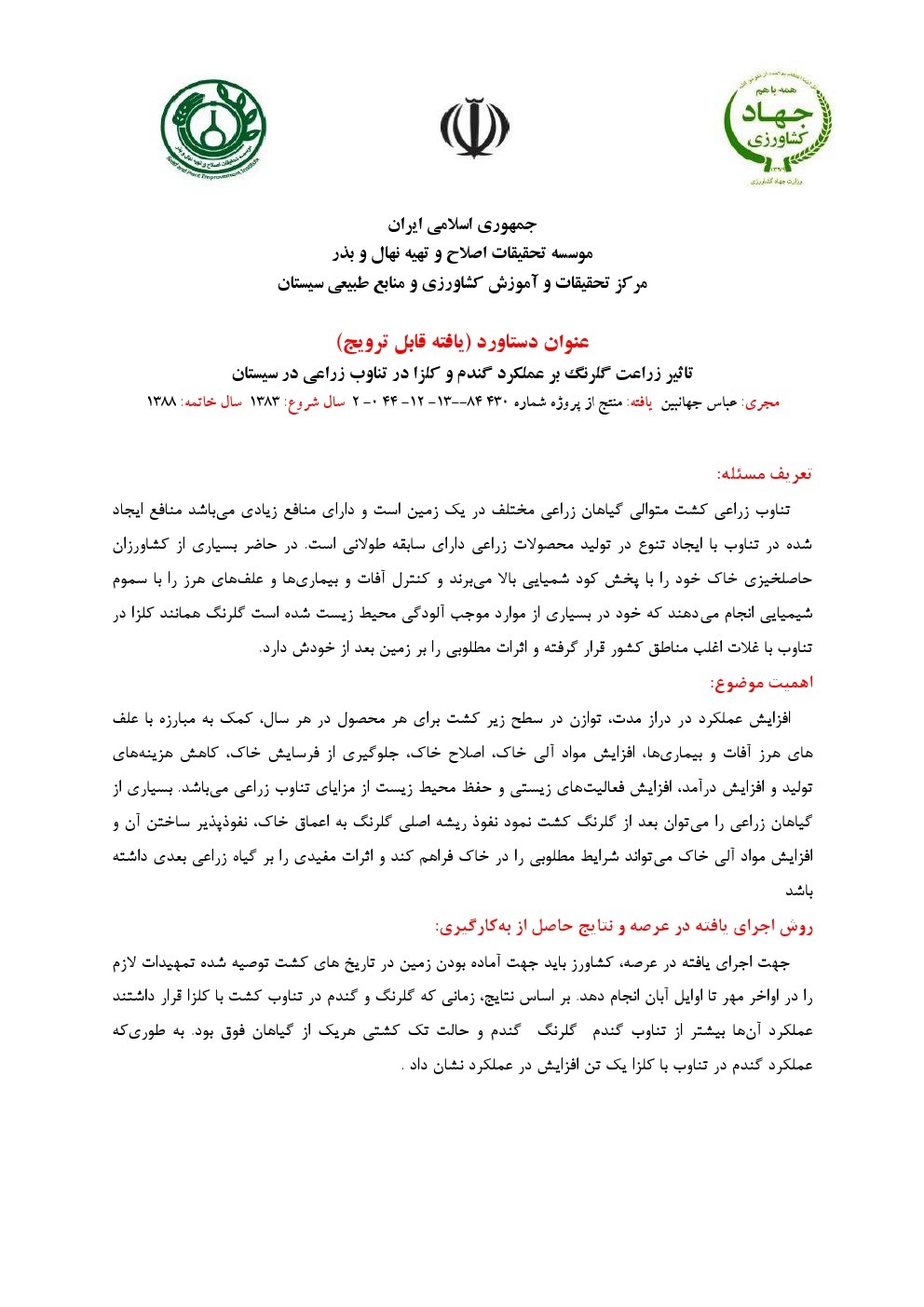 تاثیر زراعت گلرنگ بر عملکرد گندم و کلزا در تناوب زراعی در سیستان
