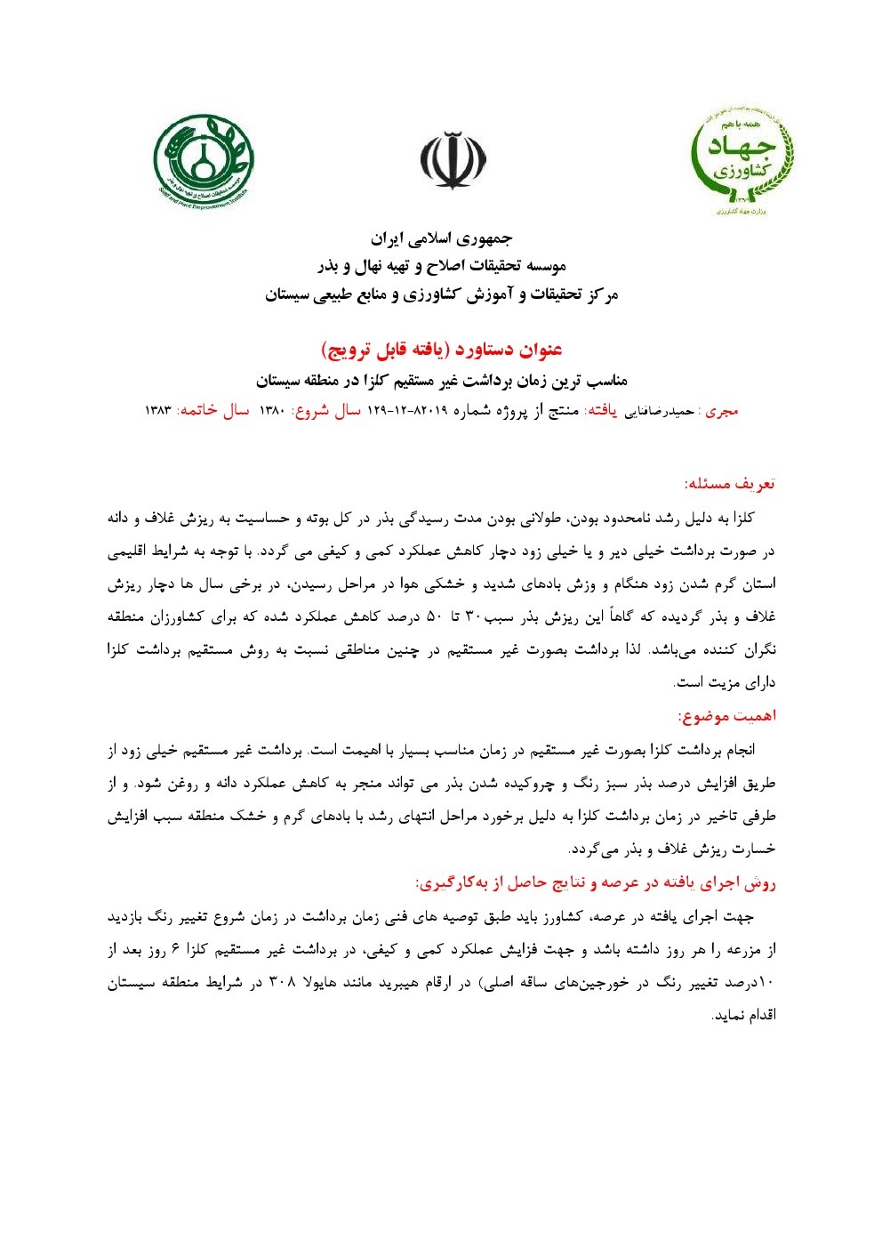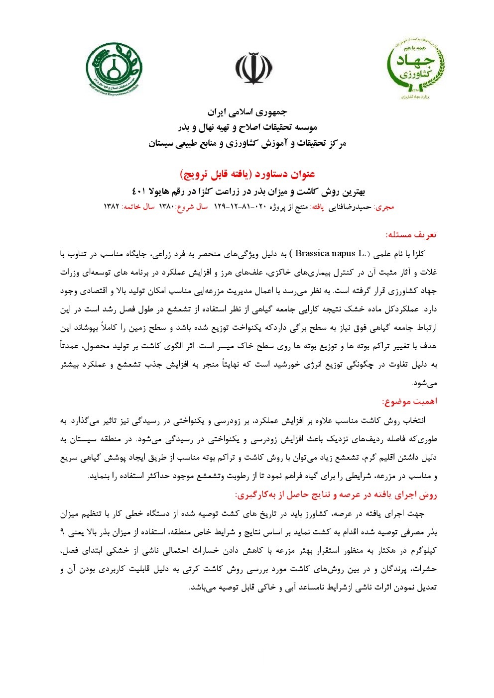 مناسب ترین زمان برداشت غیر مستقیم کلزا در منطقه سیستان