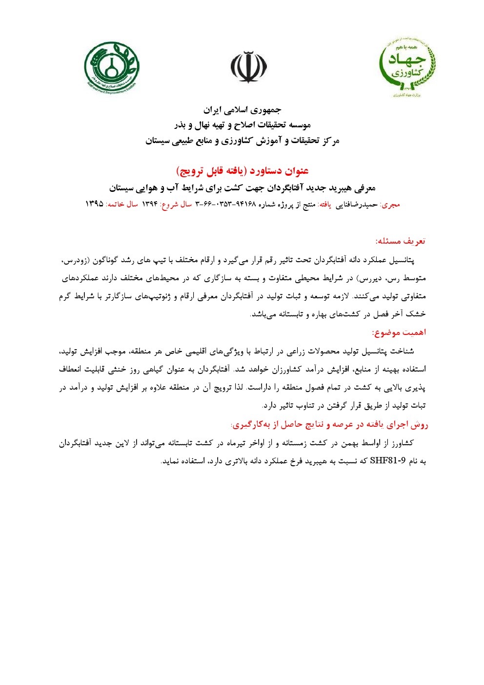 معرفی هیبرید جدید آفتابگردان جهت کشت برای شرایط آب و هوایی سیستان