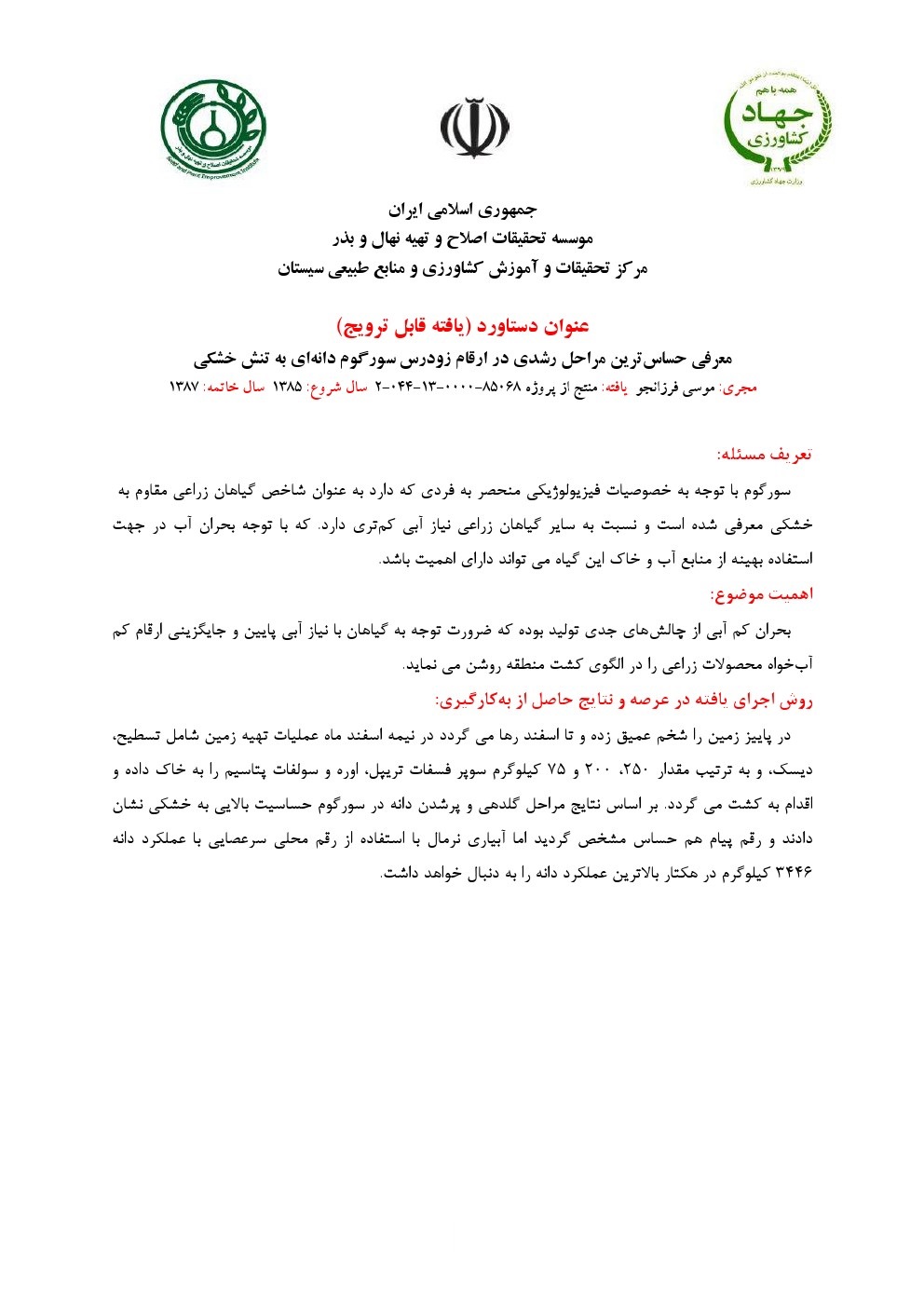 معرفی حساس­ترین مراحل رشدی در ارقام زودرس سورگوم دانه‌ای به تنش خشکی