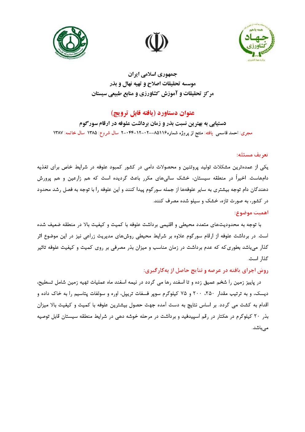 دستیابی به بهترین نسبت بذر و زمان برداشت علوفه در ارقام سورگوم