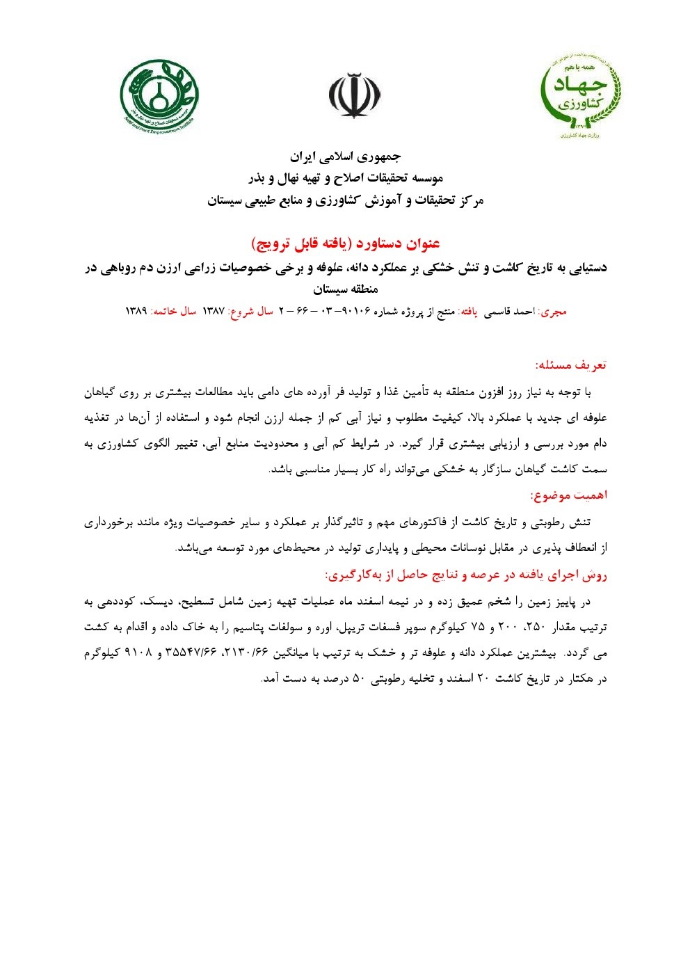 دستیابی به تاریخ کاشت و تنش خشکی بر عملکرد دانه، علوفه و برخی خصوصیات زراعی ارزن دم روباهی در منطقه سیستان