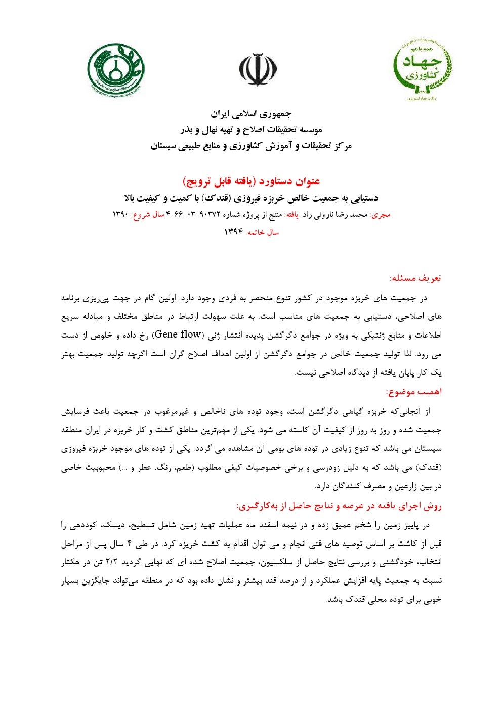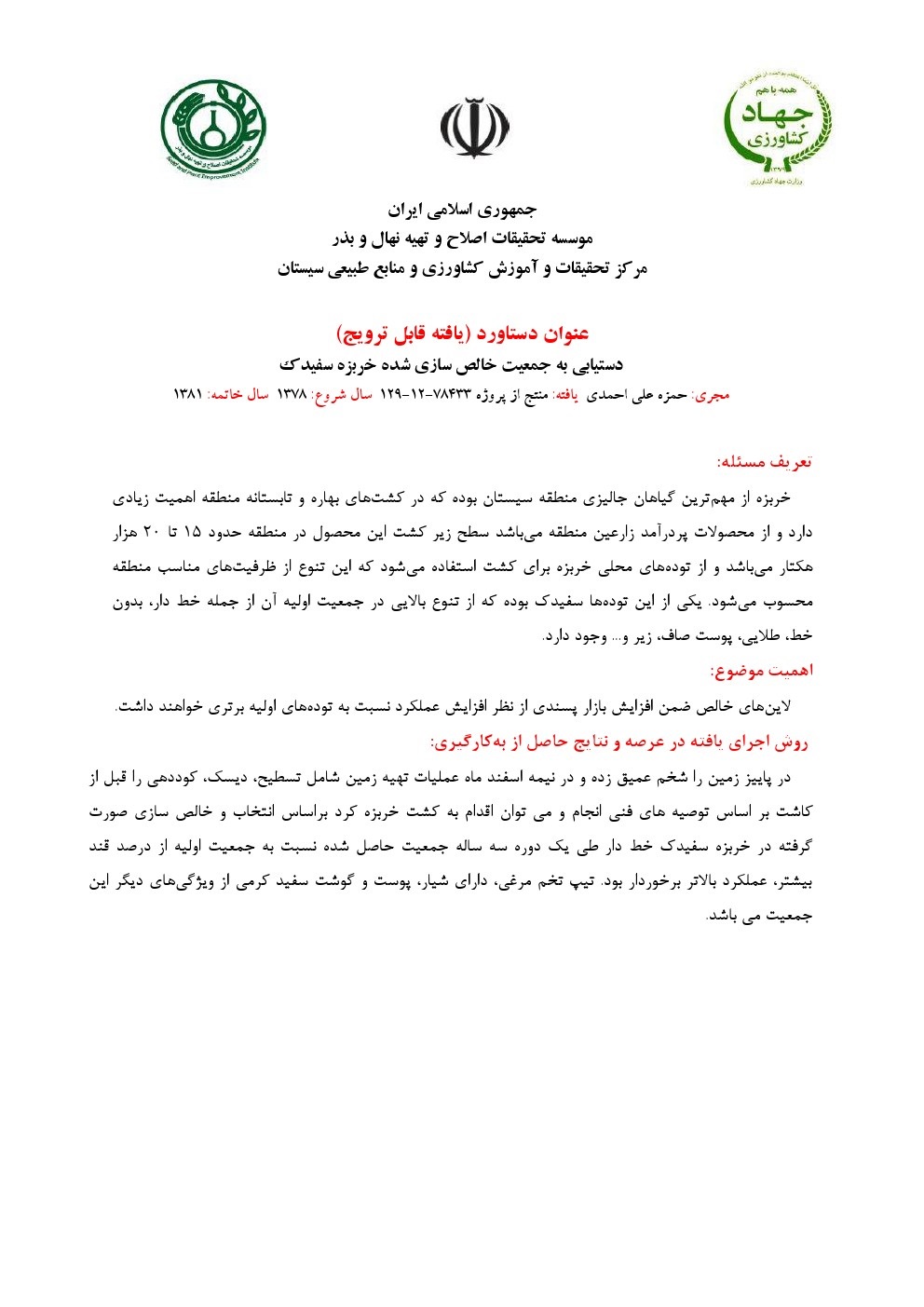 دستیابی به جمعیت خالص خربزه فیروزی (قندک) با کمیت و کیفیت بالا