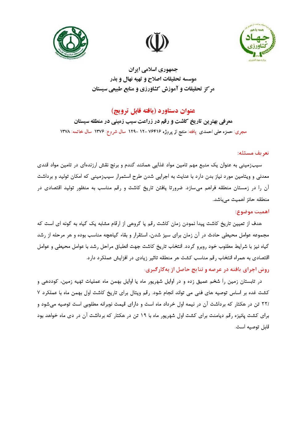 معرفی بهترین تاریخ کاشت و رقم در زراعت سیب زمینی در منطقه سیستان