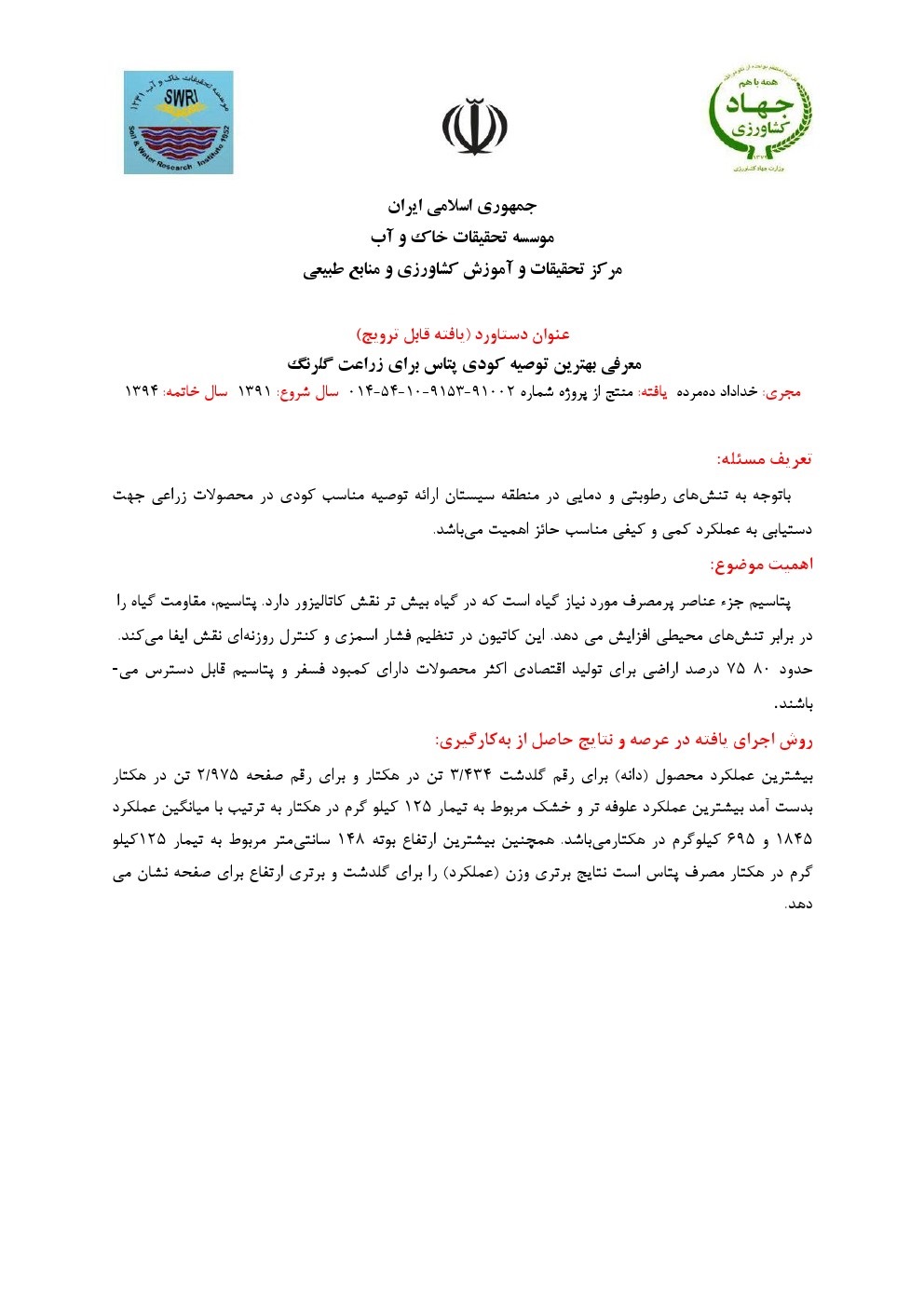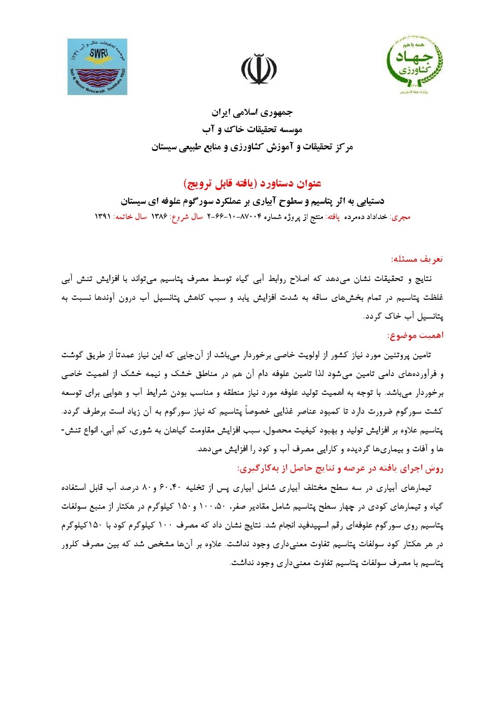 دستیابی به اثر پتاسیم و سطوح آبیاری بر عملکرد سورگوم علوفه ای سیستان