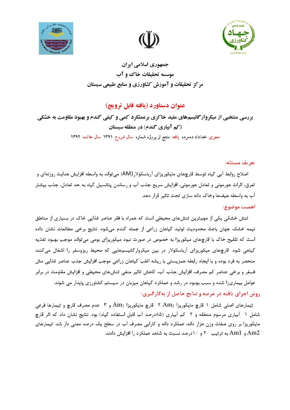 بررسی منتخبی از میکروارگانیسم‌های مفید خاکزی برعملکرد کمی و کیفی گندم و بهبود مقاومت به خشکی (کم آبیاری گندم) در منطقه سیستان