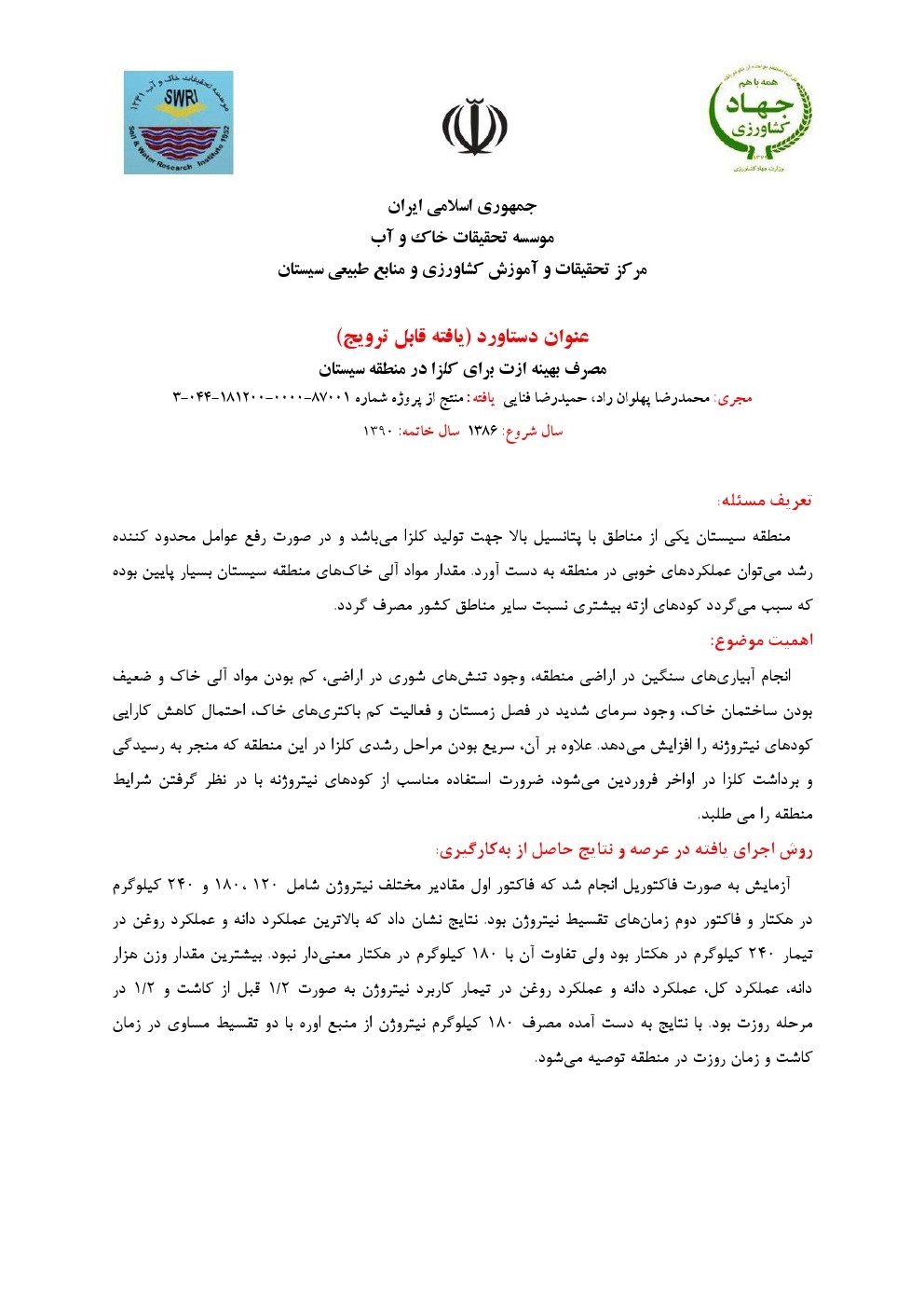 مصرف بهینه ازت برای کلزا در منطقه سیستان