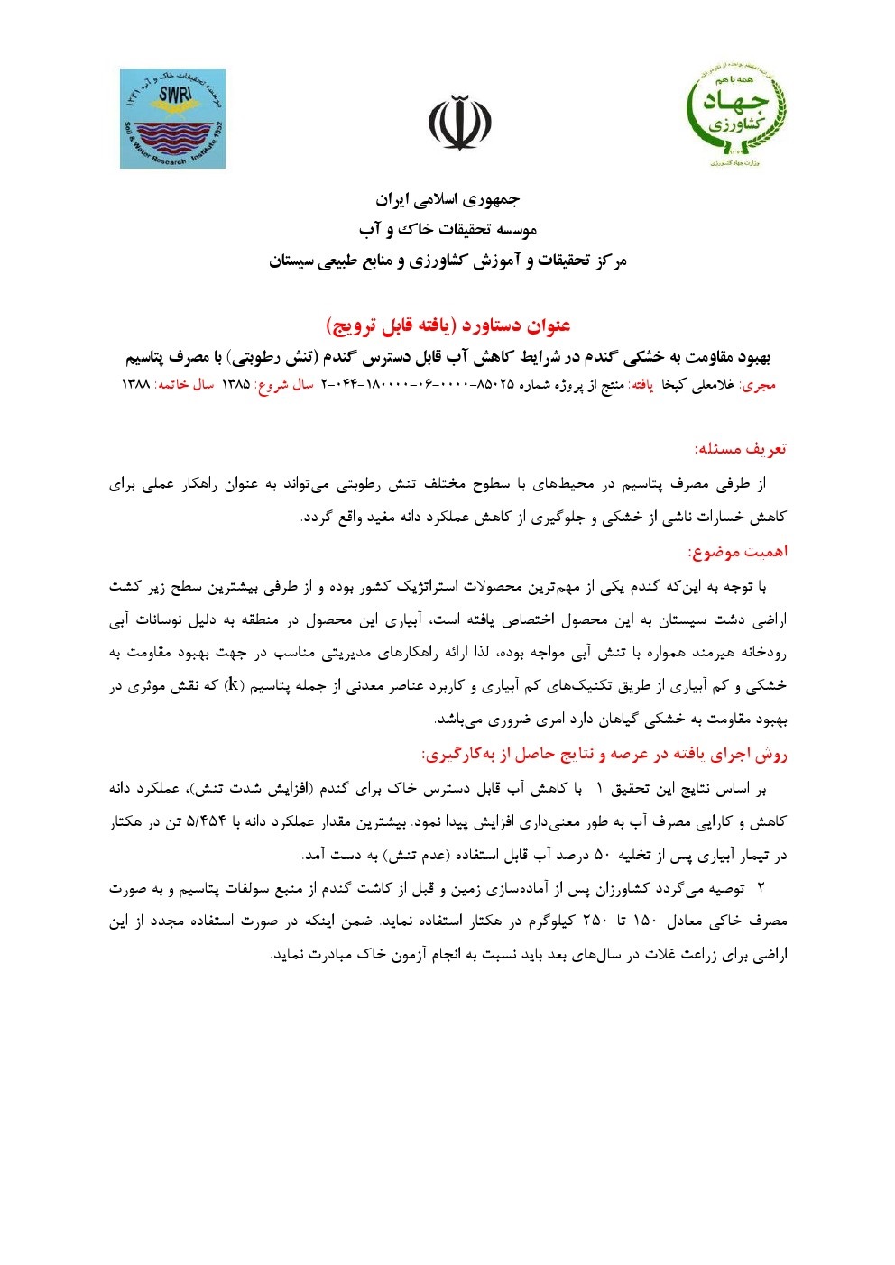 بهبود مقاومت به خشکی گندم در شرایط کاهش آب قابل دسترس گندم (تنش رطوبتی) با مصرف پتاسیم