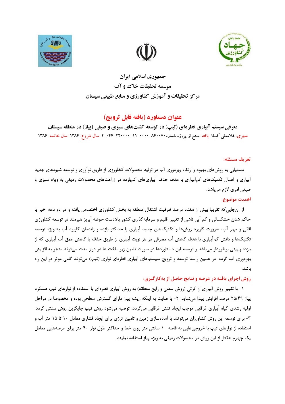 معرفی سیستم آبیاری قطره­ای (تیپ) در توسعه کشت­های سبزی و صیفی (پیاز) در منطقه سیستان