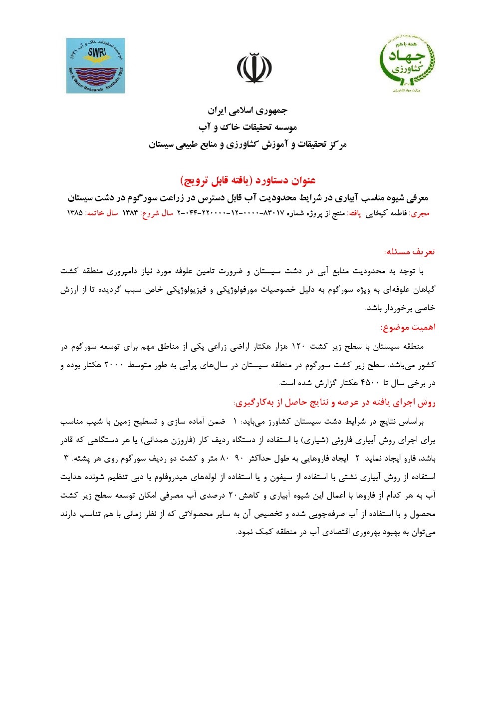 معرفی شیوه مناسب آبیاری در شرایط محدودیت آب قابل دسترس در زراعت سورگوم در دشت سیستان