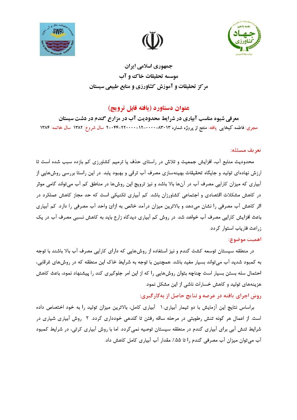 معرفی شیوه مناسب آبیاری در شرایط محدودیت آب در مزارع گندم در دشت سیستان