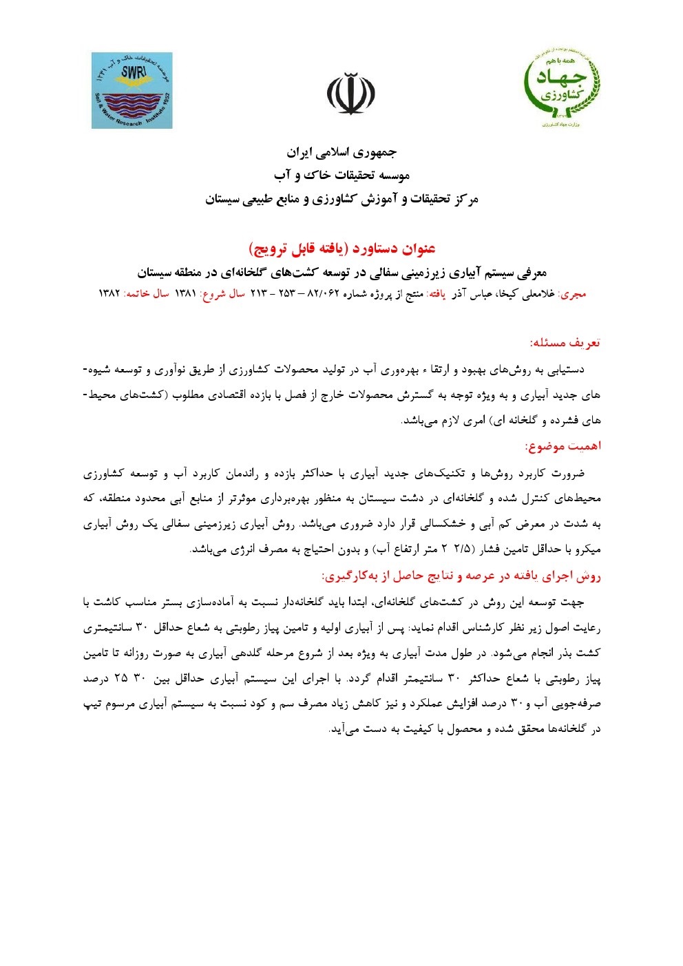 معرفی سیستم آبیاری زیر­زمینی سفالی در توسعه کشت­های گلخانه­ای در منطقه سیستان