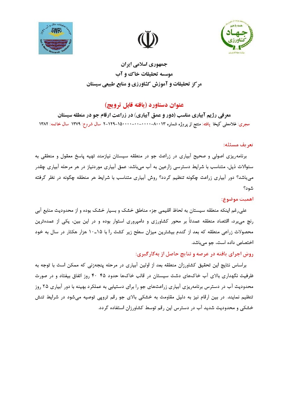 معرفی رژیم آبیاری مناسب (دور و عمق آبیاری) در زراعت ارقام جو در منطقه سیستان