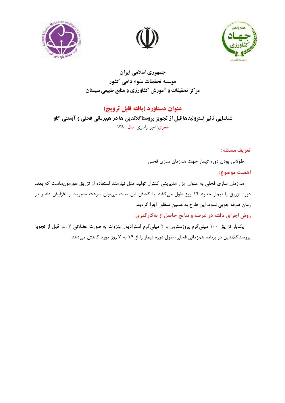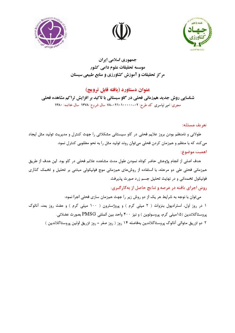 شناسایی روش جدید هم زمانی فحلی در گاو سیستانی با تاکید بر افزایش تراکم مشاهده فحلی |