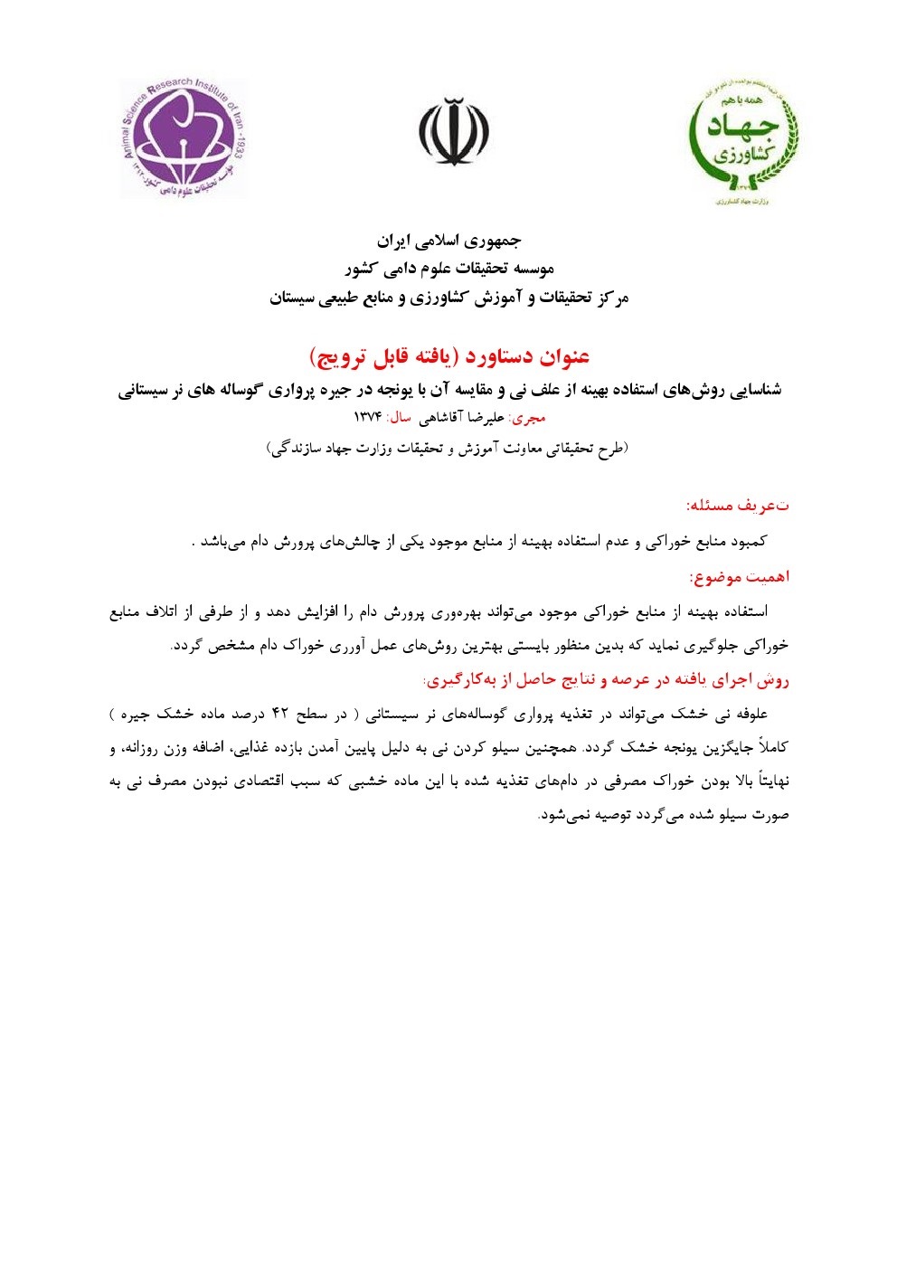 شناسایی روش های استفاده بهینه از علف نی و مقایسه آن با یونجه در جیره پرواری گوساله های نر سیستانی |
