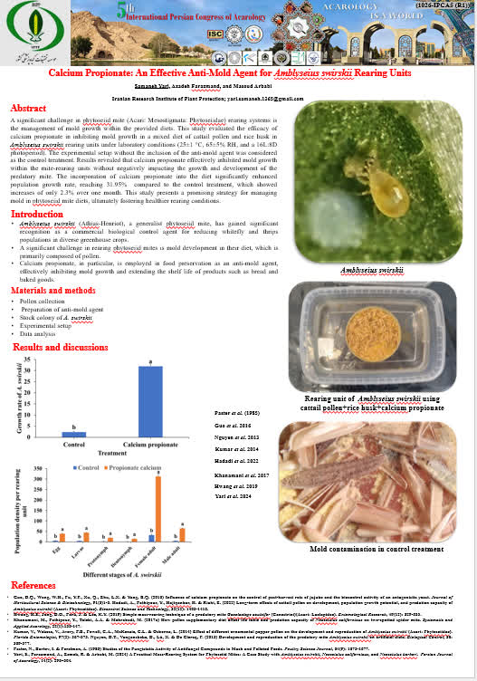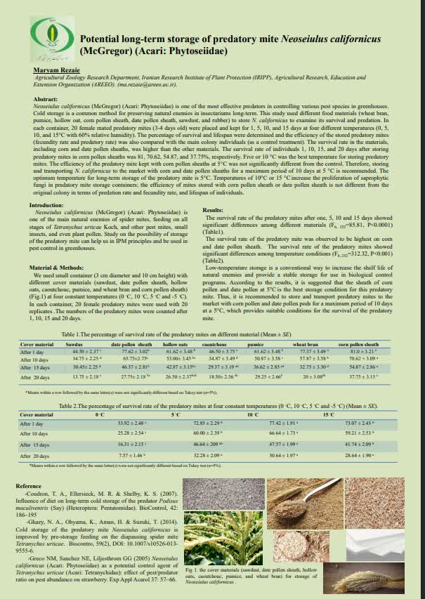 وی در سخنرانی خود پروتکل کاربردی، حاصل از تحقیقات بخش، برای پرورش کنههای شکارگر خانواده فیتوزئیده (Acari: Phytoseiidae) را ارائه نمود.