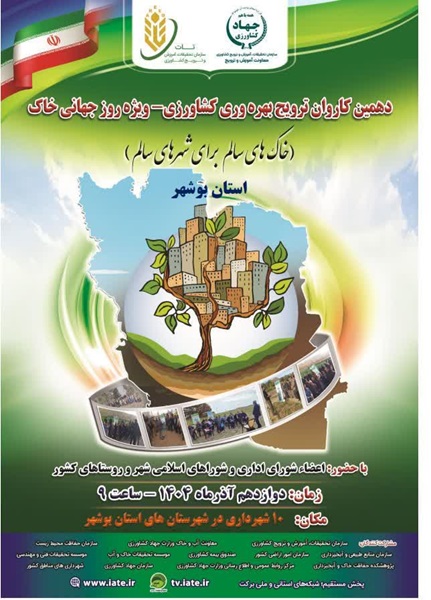 به گزارش روابطعمومی مرکز تحقیقات و آموزش کشاورزی و منابع طبیعی استان بوشهر، دهمین کاروان ترویجی بهرهوری کشاورزی همزمان با سراسر کشور و در راستای گرامیداشت روز جهانی خاک با موضوع «خاکهای سالم برای شهرهای سالم»، در استان بوشهر اجرا شد. این برنامه با حضور اعضای هیأت علمی و کارشناسان مرکز تحقیقات بوشهر و با همکاری مدیریت ترویج سازمان جهاد کشاورزی استان به اجرا درآمد.