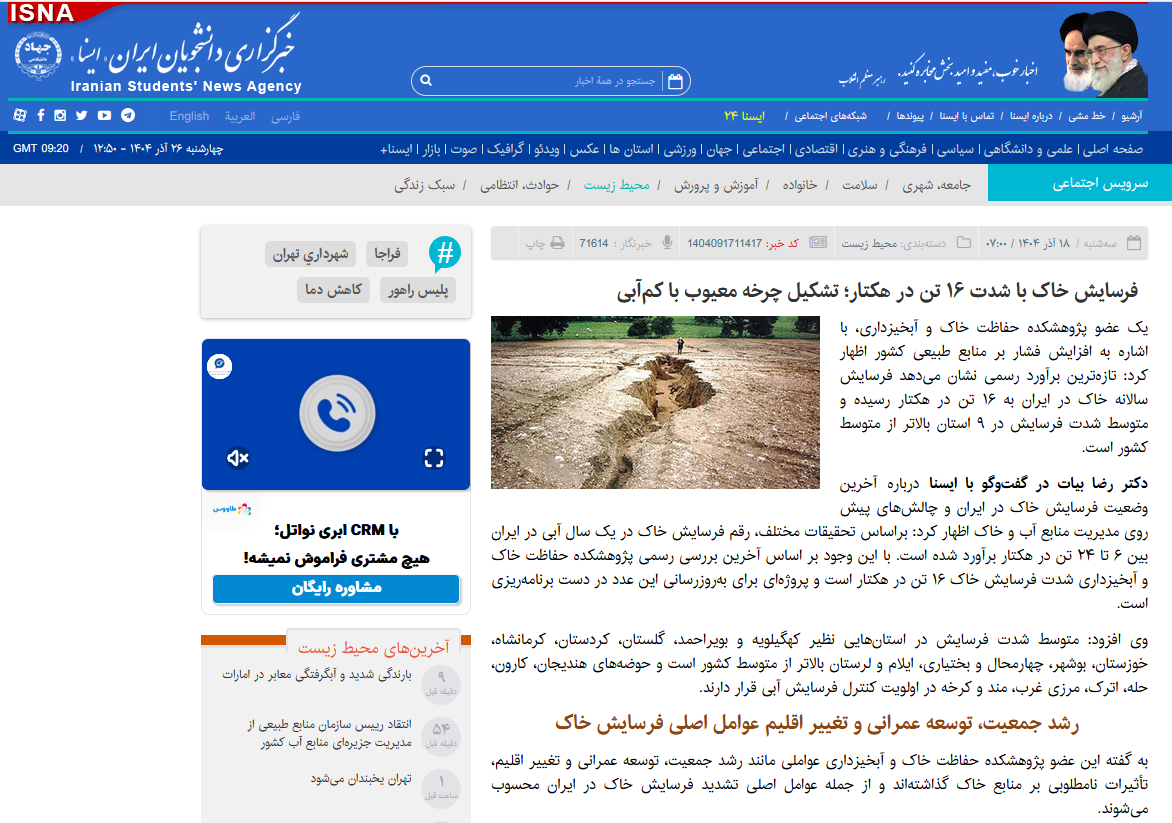 گزارش روابط عمومی پژوهشکده حفاظت خاک و آبخیزداری، رضا بیات عضو هیئت علمی پژوهشکده حفاظت خاک و آبخیزداری و عضو گروه پژوهشی مهندسی حفاظت آب و خاک، با اشاره به وضعیت نگرانکننده منابع خاک کشور، از افزایش شدت فرسایش خاک خبر داد. وی بیان کرد که میزان فرسایش خاک در کشور به طور میانگین حدود ۱۶ تن در هکتار در سال برآورد میشود. این میزان فراتر از حد قابل تحمل بوده و تهدیدی جدی برای منابع پایه به شمار میرود.